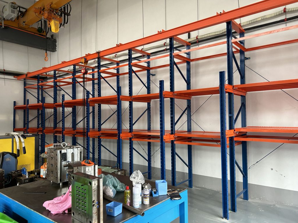 外圍車間選擇底部鏤空式博儲全抽模具架帶工字鋼天車,配手拉葫蘆,底部放置托盤,通過手動搬運車存放模具,中間層使用手拉葫蘆配合模具架完成存放;